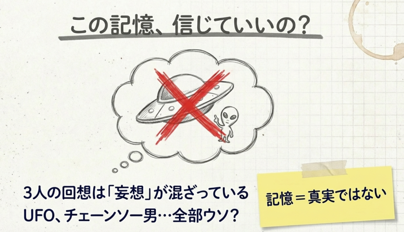 つまり、3人が「思い出した」と言っても、それが事実かどうか常に疑わなければいけない。推理ものを見ながら「証拠」そのものを信用できないという、なかなかしんどい構造になっています。